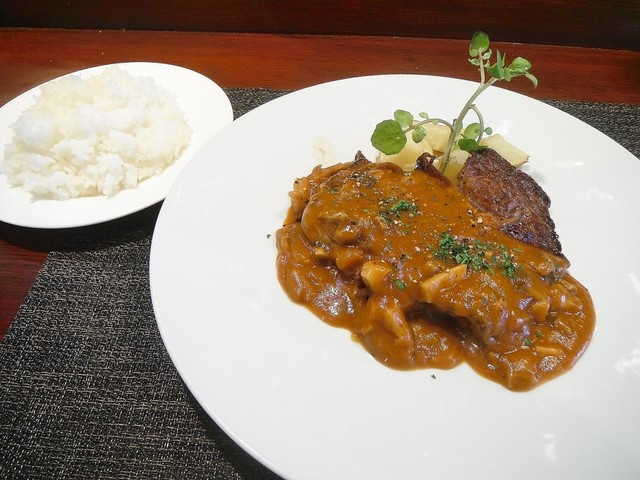 牛ロースステーキは圧巻のボリューム感。ソースが被って分かりづらいが表面も中も良い色合いです。トマトが効いたデミグラスソースは何にでも良く合いそう。老舗の洋食屋のデミグラスソースってエグい、酸っぱい、苦いと3拍子揃った物が多いがこちらは適度で嫌みがありません。