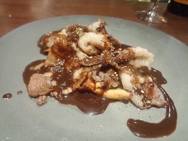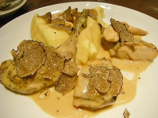 ポルト、コニャック、コンソメに浸けて真空調理したプーレにそのキュイソンをフォアグラで繋いだアルビュフェラっぽいソース。豚の膀胱は使ってないが、ベッシー風という表記をしたのは豚の膀胱を使ってないだけで調理の理論はベッシーと同じであるからです。シェフ曰くフランスの星付きの店でも最初にある程度加熱してから膀胱で包むというパフォーマンス的な要素が多く本来の目的というか意味は成してないという。