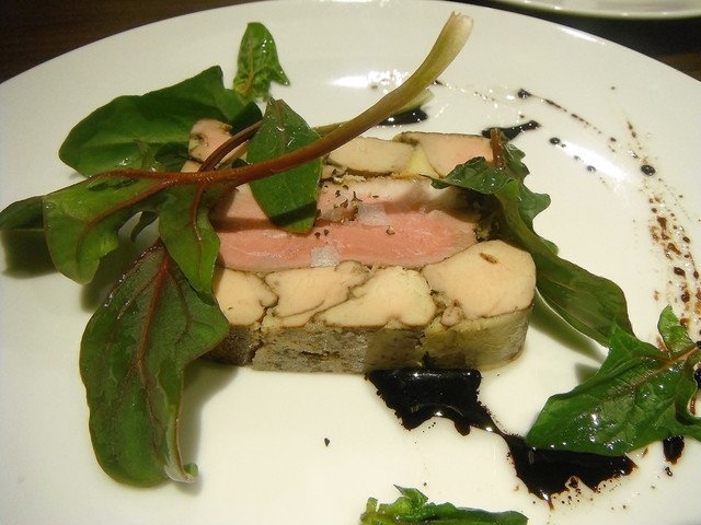 鴨の胸肉の燻製と焼フォアグラのテリーヌ、バルサミコ風味