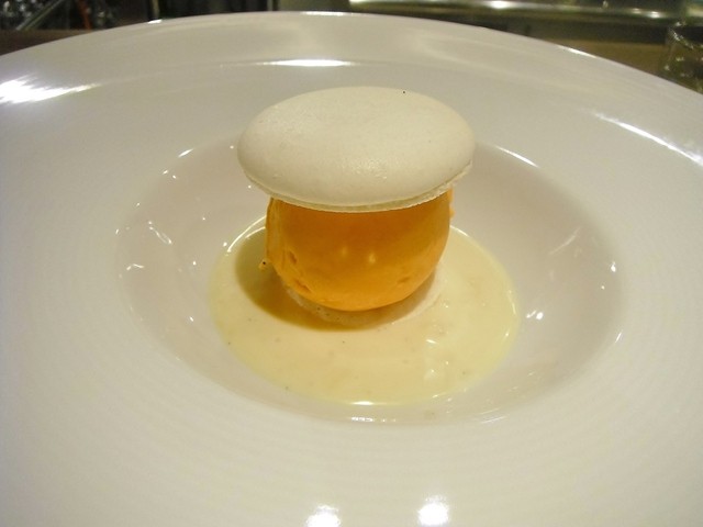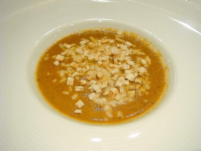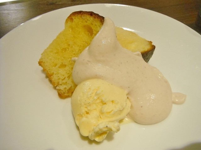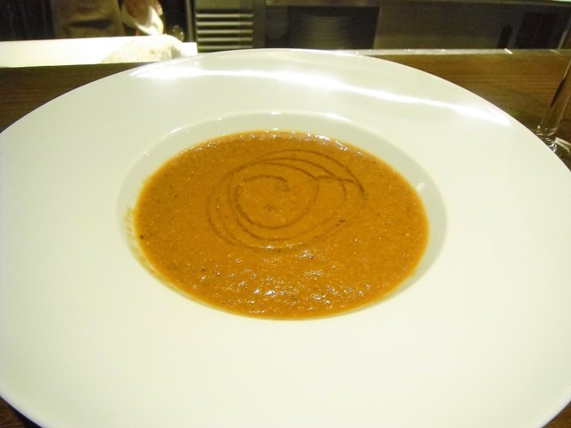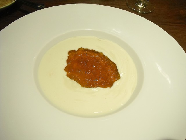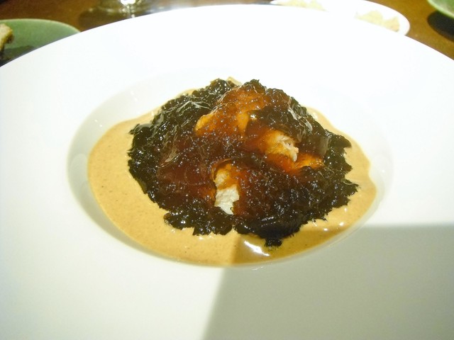 ヴィシソワーズにコンソメのジュレを乗せてた物。珍しくオーソドックスな料理ですがこちらはコンソメジュレの芳香が良いのとヴィシソワーズも無駄に乳製品で伸ばしてないのでじゃがいもの味をしっかり味わえて良かった。