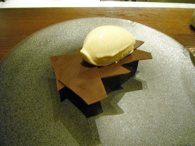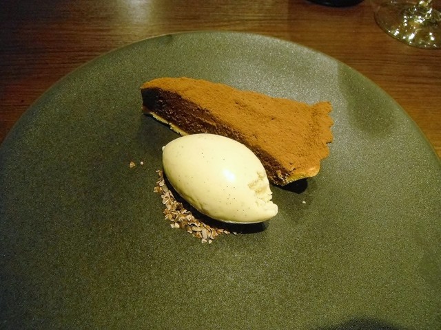 ここ3回くらい連チャンで出てきた鰻。好きですから全く問題ありません。最初にある程度真空調理をしてから仕上げに炭火焼き。牛頬の煮込みと雑穀を合わせたリゾットの上に鰻を乗せ仕上げに赤ワインソース。プチプチした食感の雑穀は白米とは違ったアクセントがありどっちかというとガルニ的なニュアンスに感じます。