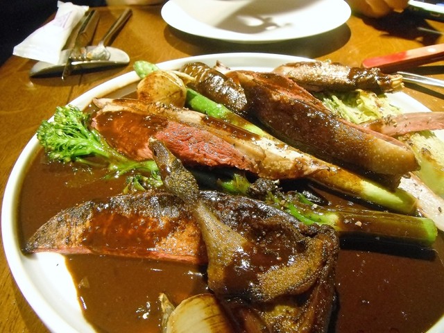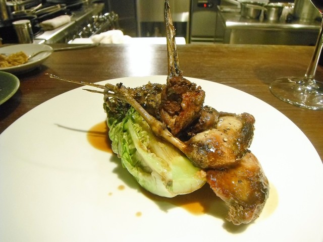 魚料理は真ハタとホタテ、イカのブイヤベース。真ハタとホタテはスープ・ド・ポワソンの中で火入れ。イカだけ別でプワルでソテした物を後で乗せる。煮込むというより蒸すといった加熱法で真ハタの皮下のゼラチン質がうまい事溶けだして身の食感も凄く良い。スープ・ド・ポワソンは昔から美味いのでブイヤベースが不味いはずは無いのだが調理法も含めとても感心させらる一皿でした。