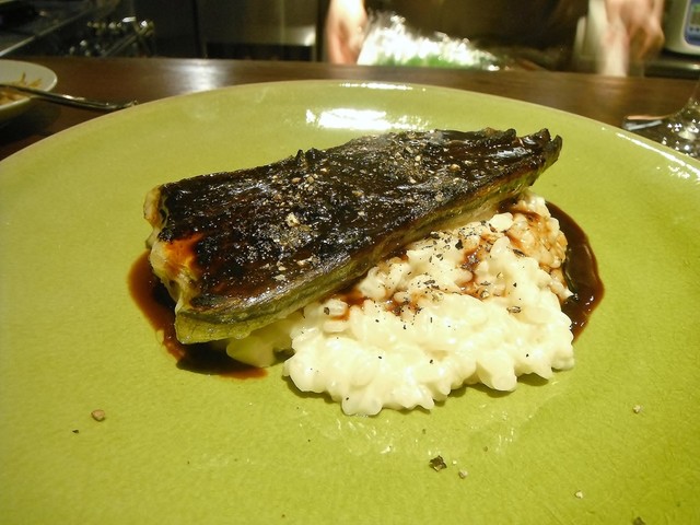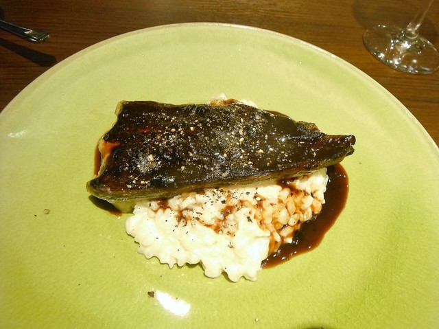 サラマンで焼いた高級鰻をリゾットに乗せ甘めのソースで。鰻は背側にだけ少しソース乗せて焼いたかと思いますが腹側のふっくらした身の部分の味とのコントラストがあり美味いです。リゾットの方にはほぼ味らしい味がない分バランス感が良いですね。