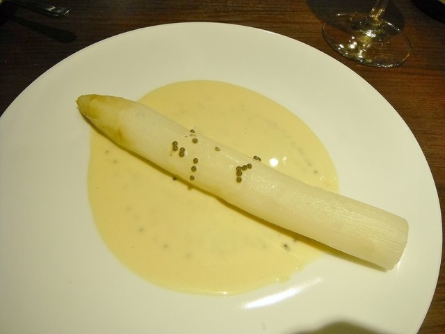 ホワイトアスパラは茹でた物ですが強めの沸騰した湯で茹でてたのと茹でてそのまま皿に乗せた物なので多分ですけど調理法的にはポシェでもブランシールでもない。何て言うんでしょうか?とにかく茹でホワイトアスパラにこちらの定番超高級キャビアを8gも使ったソースはオランデーズっぽいがホタテで繋いだ物との事。超最高級キャビアの塩味が良いアクセントになってます。
