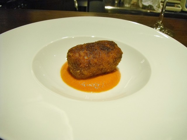 ちょっと中井先生的にはあまり見ないタイプの料理な印象。ソースロメスコはトマト、パプリカ、ニンニクを合わせソース。バスクの方のソースでしょうか??こういうパネした揚げ物も揚げる休ませるみたいな工程を踏んだりするんですね。勉強になりました。甲殻類好きには当然不味いはずなどない料理。