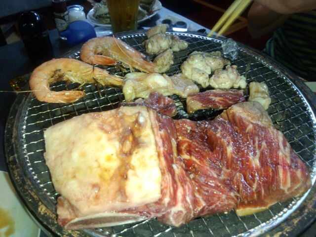 魚貝類豊富で殻付きホタテ。デカクて網半分占拠…チョイト網が小さいかな…