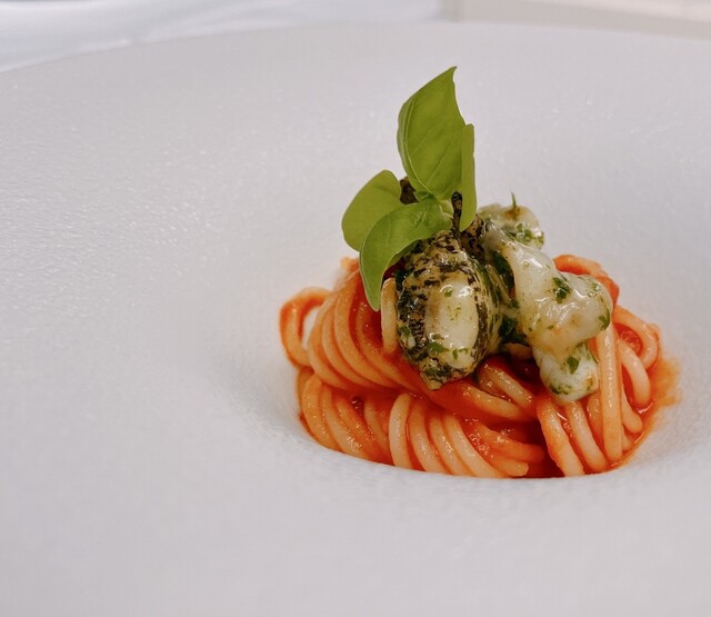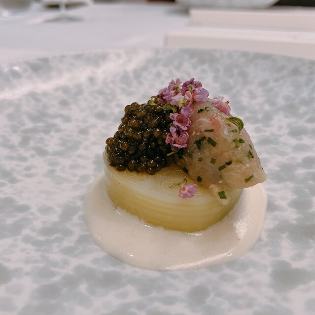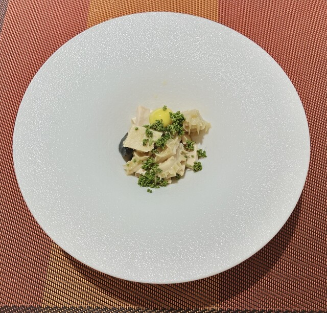 そして、一番印象に残ったのは蛍烏賊。蛍烏賊をカダイフで巻いて、弾けないか不安になるほどサックサクに火入れ。冷製フォアグラとジャガイモのエスプーマで濃厚だけどキレのいい味わいに。驚きの組み合わせ、絶品です。