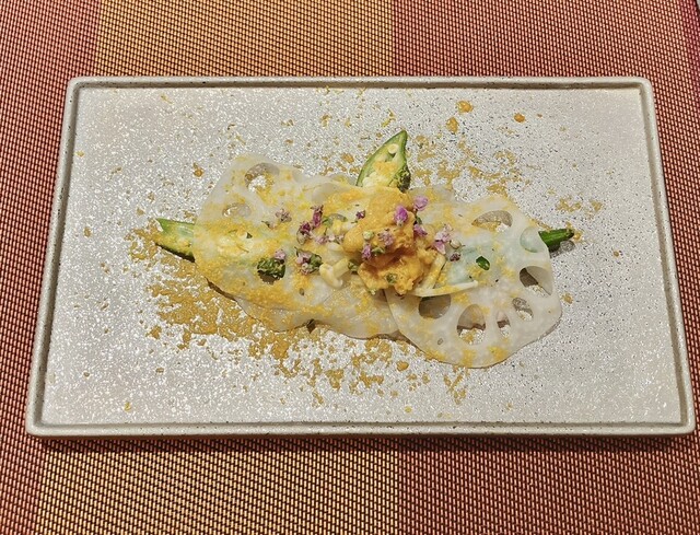 優しい味わいの京都産の筍は、活〆カレイ、北海道産雲丹、花わさび、紫蘇花、柚子香るカルパッチョ仕立て。初めていただく楽しい味わい。