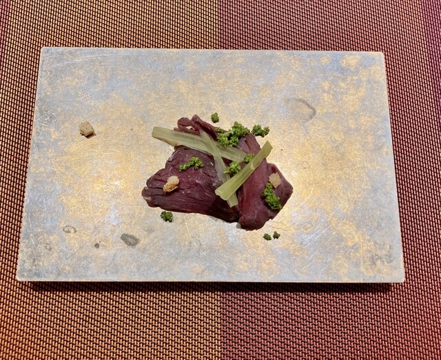 まずは、馬肉のカルパッチョから。低音調理され、蕗と花山椒のアクセントがよく噛み締めることに旨みが広がります。