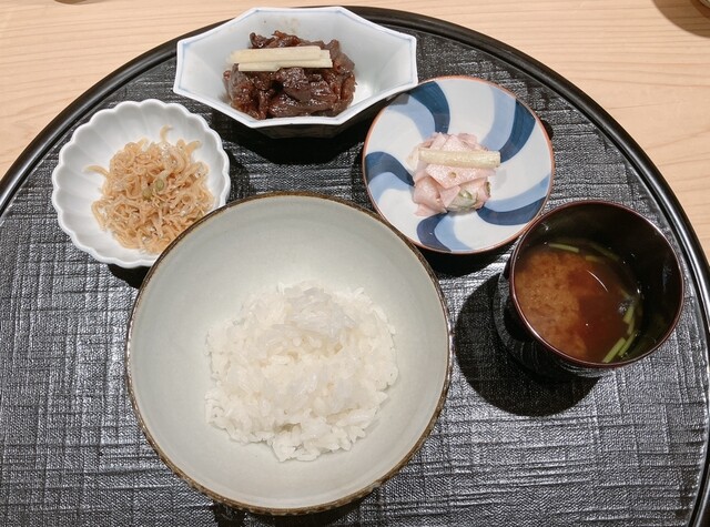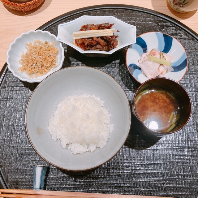安定の釜炊きご飯に、牛肉しぐれ煮 、じゃこ山椒、香の物、赤出汁。
