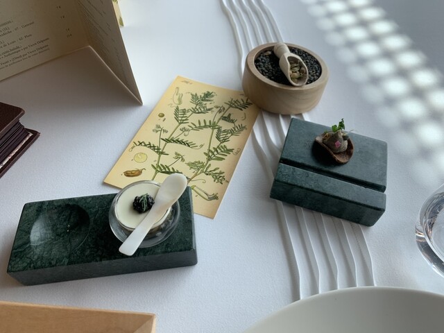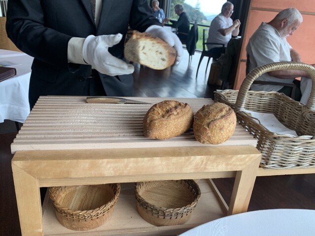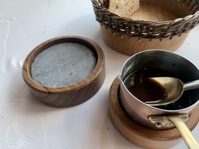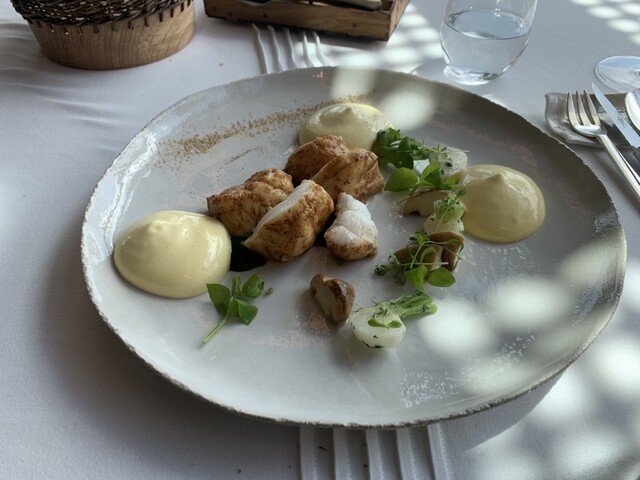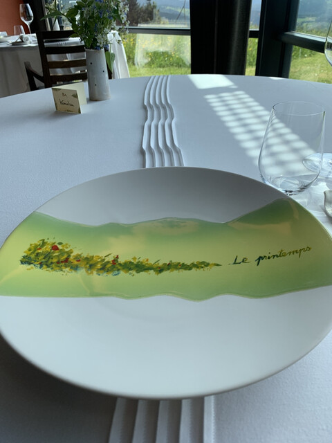 オーベルニュ地方鄙びた人口200人Saint-Bonnet-le-Froid村、村出身レジエス・マルコン、95年ポキューズドールウィナー、ミシュラン三つ星・ルレエシャトー。次男が今年ポキューズドール2代続けて優勝しましたが、いまだにバリバリのトップシェフ。平日ランチですが、予約困難だけに当然満席。メニュー見るとテイスティングはどえらい量なので、アラカルト前菜・魚・肉の3点にします。前菜プイグリーンレンズ豆のラグー、トリュフとポーチドチキンエッグ、ソース2種が絶妙、加熱石の上に置かれ熱々、飲み干します(๑˃̵ᴗ˂̵)魚はアンコウ、コリコリでなく神経〆したようなスモーク相まって滋味溢れる柔らかさ、瞬殺。しかもシェフみずから説明さばいてくれますから(*´︶`*)肉はピジョン、これまた大ぶり、火入れ完璧、これまた瞬殺。ここまででお腹パンパン、濃厚な2時間でした〜昼もいいけど次回来るとしたら夜ですね。