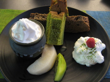 抹茶とほうじ茶のシフォンケーキ、ソフトクリーム、生クリーム、梨、キウイ