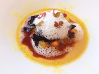 コンソメゼリーのプルプル感とネットリとしたフォワグラのコンフィのコントラストが楽しめます。味わいはバルサミコが強いので、意外にもあっさりとした後味です。前回、食べた『タスマニアサーモンの瞬間燻製』の方が好みかも。