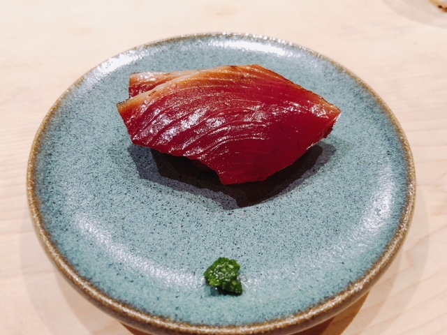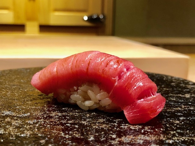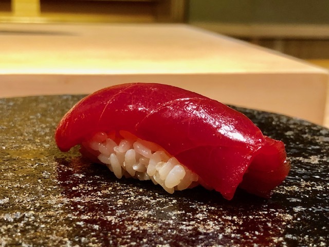 宮城県塩釜産旋網の176.2キロ。ビロードのような色味に、ベルベットのような舌触り。漬けで底上げされた旨味に食べ終えた後に残る香りが心地よい。