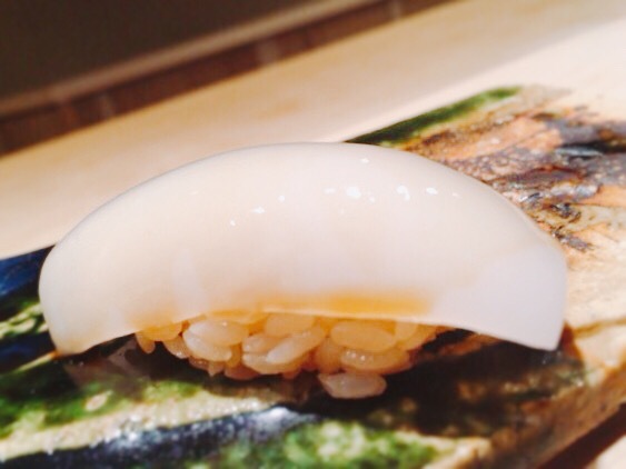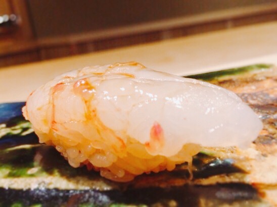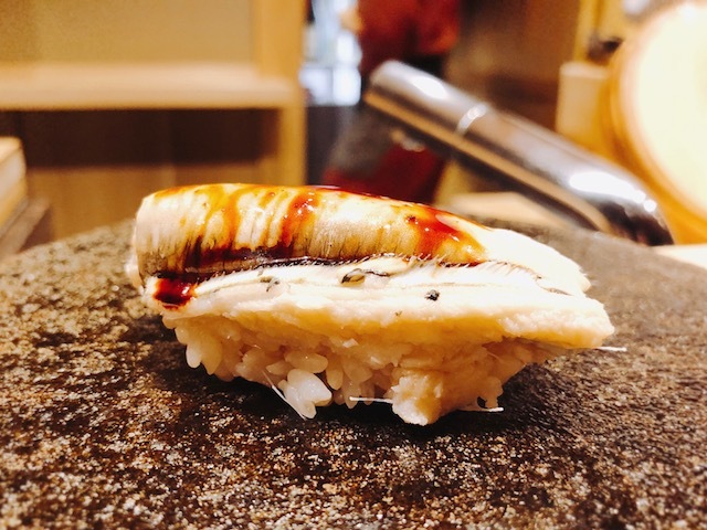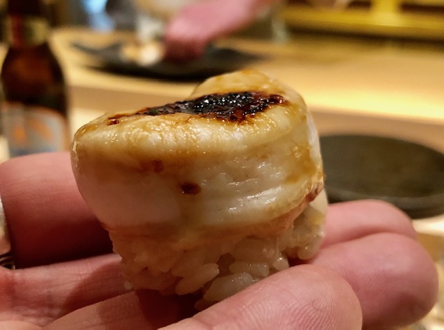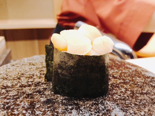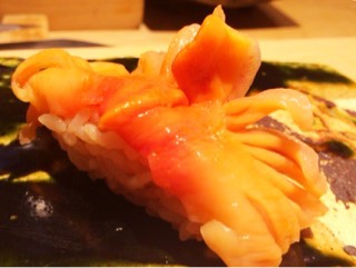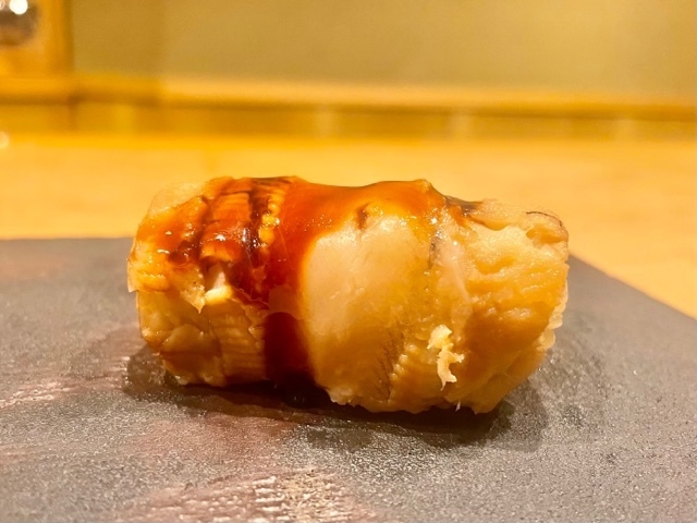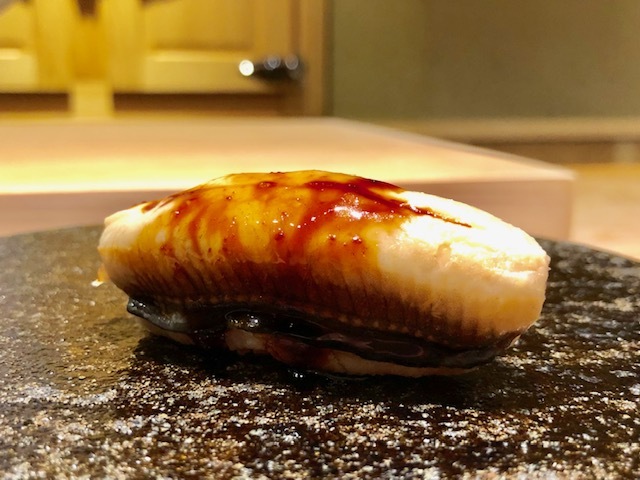 北海道野付産。磯部焼きでもいいそうですが、握りは珍しいので握りで注文。繊維質が確りとした帆立で、小気味良いサクサク感と甘味が秀逸。