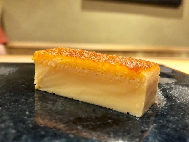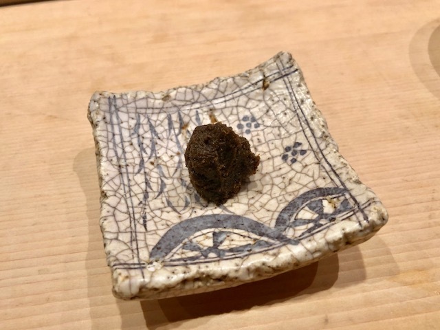 熊本県天草産。東京で提供しているのがここだけという黒雲丹。品種としては紫雲丹だそうで、甘味と苦味が混在する複雑味のある味わいと香りがあり、最後に甘味が残る素晴らしい雲丹。