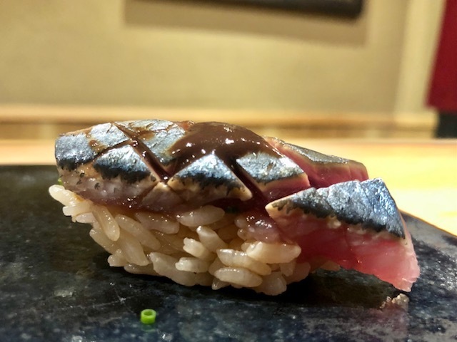 今季新作の焼いた秋刀魚の握り。皮だけを焼き上げており、身は生のままという素晴らしさ。上に乗せられた肝醤油のほろ苦さがこの旨味を締めています。