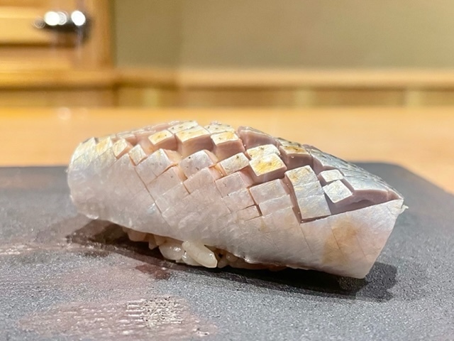 珍しく格子状に包丁を入れられて、なんともフォトジェニックな小鰭。口に入れると、小鰭のとろけ具合が異質で、瞬時にシャリと混ざり合います。