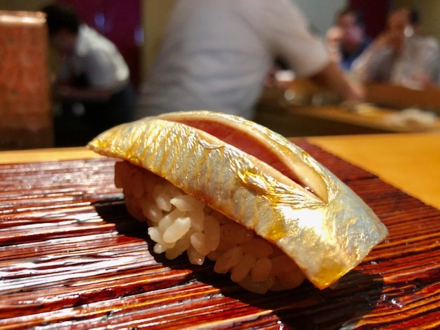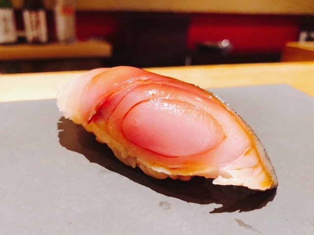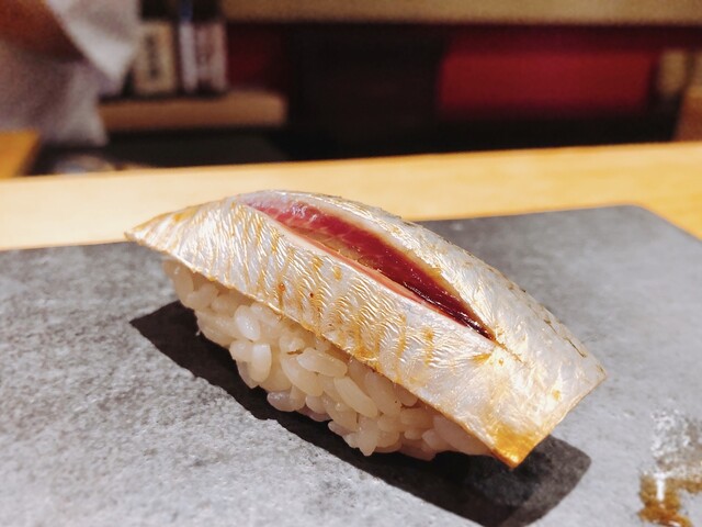 金色に輝く鰯も「すし㐂邑」のシグニチャーのひとつ。酸味の中にも確りとした旨味があり、食べ終えても尚香るような青魚の香りが凄い。