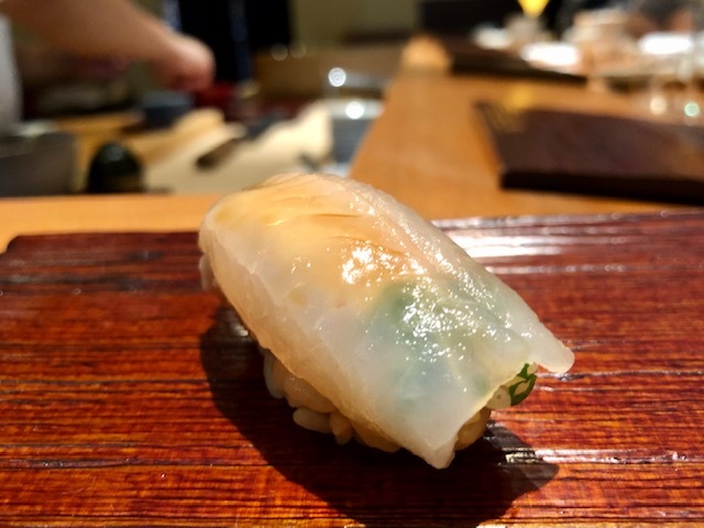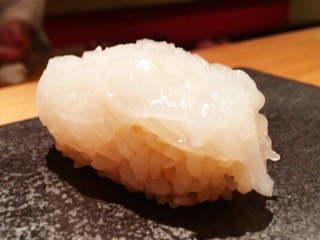 木村さんの包丁技が見れる種で、白烏賊を薄ーく薄ーく削ぎ切りにしていき、一纏めにして酢橘と塩で。コレは空気を食べる種。甘味を出しながらとろける烏賊がとてもエアリー。