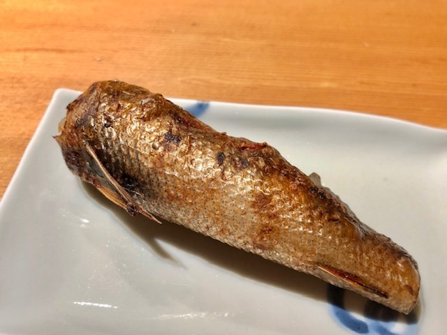 風に当てて旨味を出し、お酒で割った自家製の酒盗汁に漬けて焼いたもの。初めは酒盗の旨味がきて、後から真名鰹の旨味がグッときます。味わいと共にとろりとした食感も素晴らしい。