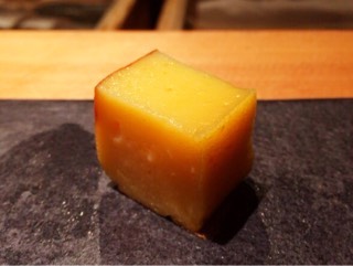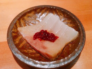 エシャロットを間に入れる1カ月熟成の鰤。クセのある鰤を見事に昇華して旨味のみを出した味わいで、エシャロットの爽やかな苦味が実にいい仕事をしており、美味しい。
