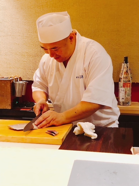 木村親方の包丁技が見られる泥障烏賊は極薄に削ぎ切りしていき、更に細かく切って纏めて握っていきます。
