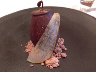 洋梨の形をしたチョコレートの中身は、洋梨のコンポートと赤ワインのムースで、表面のチョコレートと混ぜて食べます。