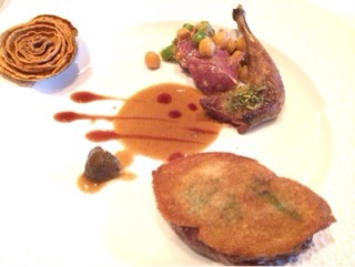 本日の魚料理は、高知産の甘鯛。ウロコを立てた松笠仕立てにしてあります。このウロコがパリパリ食感で、更に甘鯛はむっちりとしており、美味しい。ムラサキトマトソースやバジルをまぶしたドライトマトと共に食べると、味がしまる感じ。