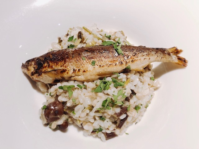 鮎と信州山菜のもち麦リゾット