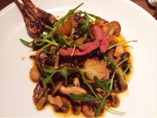 今回の訪問目的の料理。食べ比べということで、スネ肉煮込み・ロース・モモ肉・背ロースト・チェルベロ(脳ミソ)のフリットの部位が盛られています。ソースは『野ウサギ』の出汁に血とチョコレートを加えたもので、ほのかな苦みとコクがあります。