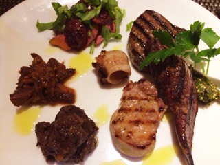 当初は『レバーのグリル』だけにしようと思ったのですが、「シェフが猟のお手伝いをしたという記念の猪で、内臓オススメですよ」と言われたので、せっかくなので。