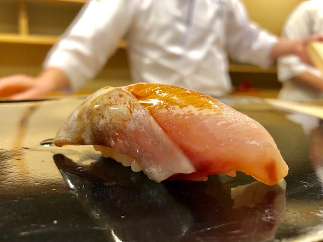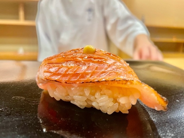 皮目を軽く炙り、脂の旨味を引き出してから握られる金目鯛。山葵と辛子の香りのハーモニーが心地よい。