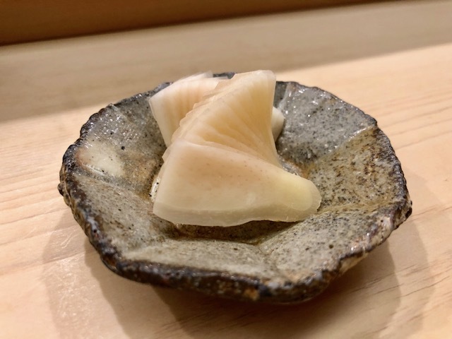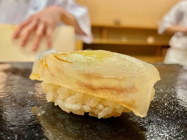 久しぶりにいただく杉田親方の新子は、2枚付け。新子とはいえ、その小さな身にジューシーさがあって、ジュワッとした旨味があります。
