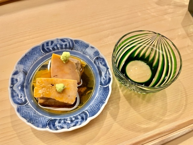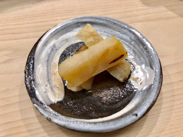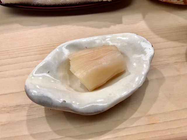 鮃は極上のモチモチ加減を楽しんでいると溢れる奥行きある甘味が凄い。つぶ貝はバリバリとした食感の中で、野生味ある甘味が映えます。いつもながら杉田親方の包丁捌きを堪能しつつ、食材の甘味と食感のコントラストが楽しめる仕立てで素晴らしい。