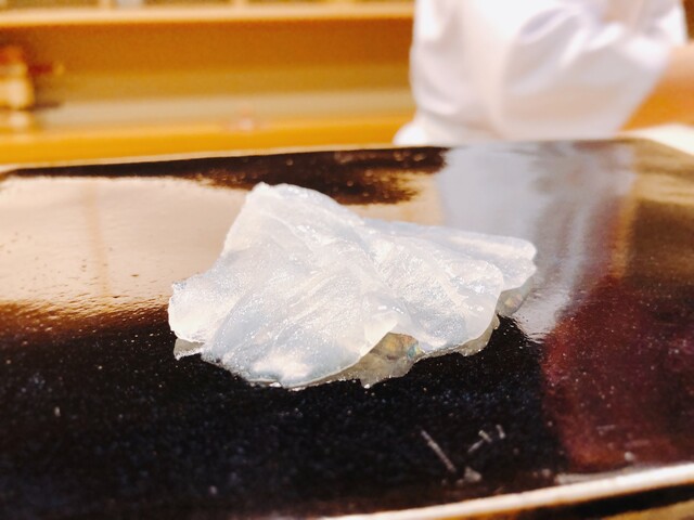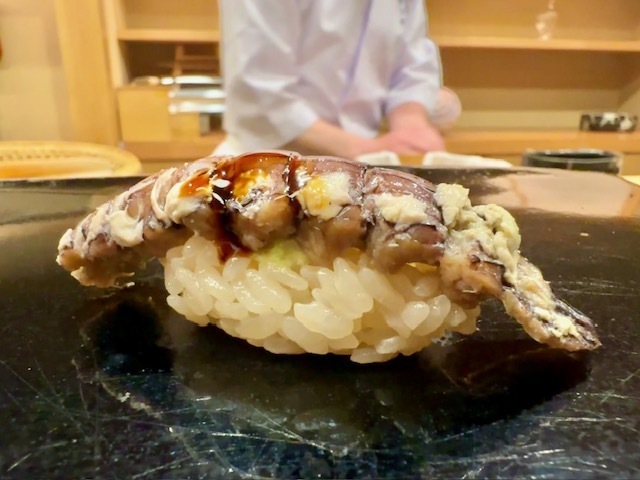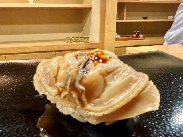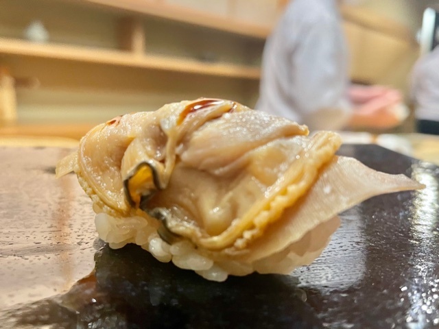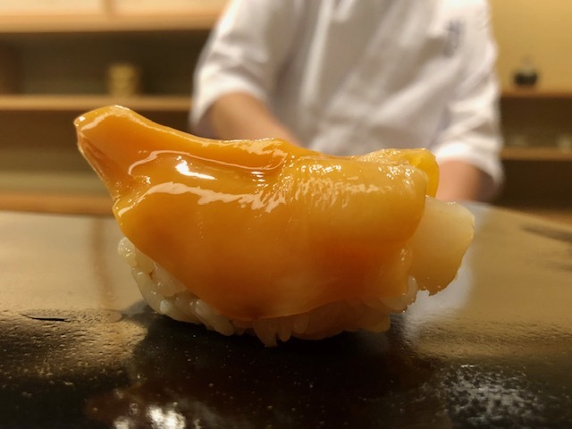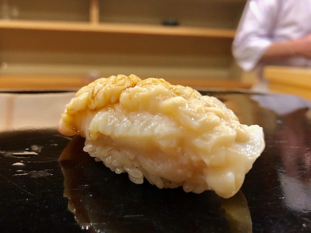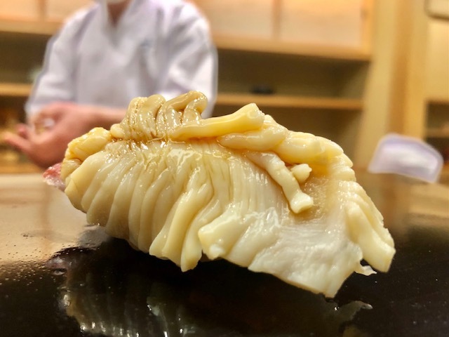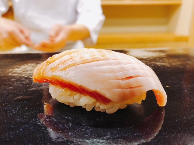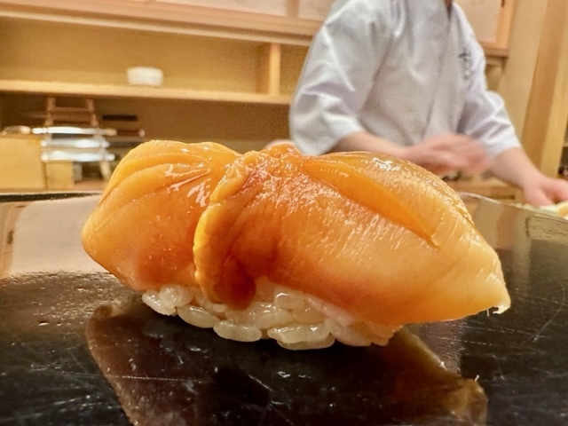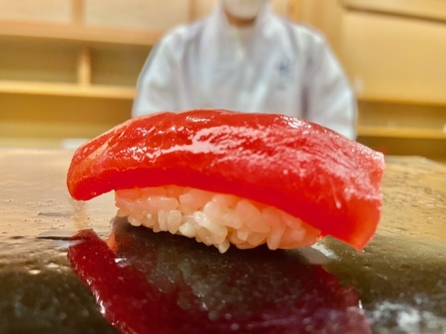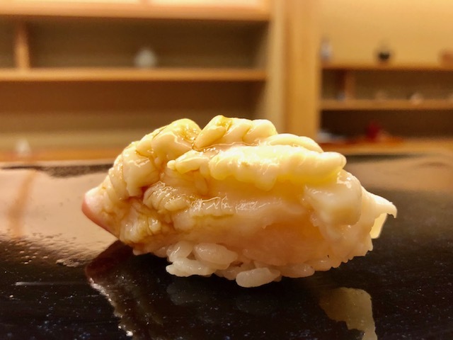 今回は青森県大間産。天身の部位を薄く切りつけ、漬けにしてから折り畳んで握られる独特な漬け。身はねっとりとし、食べ終えてからも尚、口の中にあるような存在感のある香りが素晴らしい。