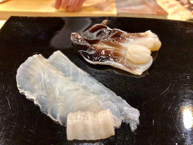 青森県産の鮃と北海道厚岸産のつぶ貝を山葵と醤油で。