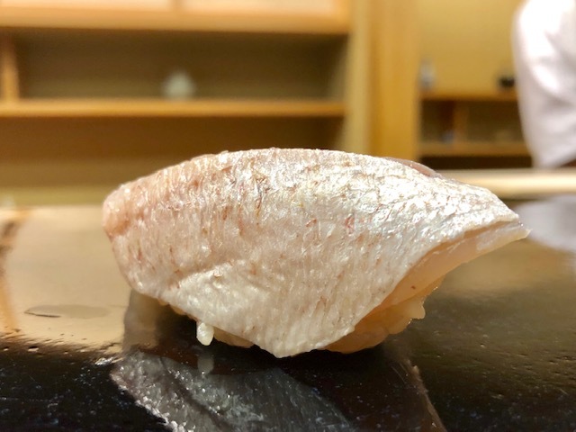 とろりととろけるような春子鯛。シャリの塩味と上に乗せた塩と酢橘で、より輪郭を成す甘味と旨味が最高の一貫。