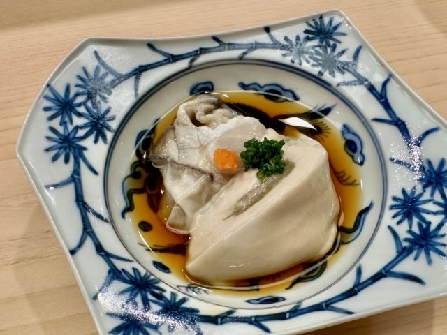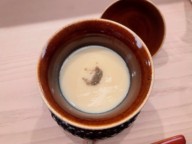 初となる茶碗蒸し。底には皮目を炙った金目鯛が入っており、上からはポン酢がかかっています。卵液のコクと金目鯛の旨味をポン酢の酸味がより引き出しています。
