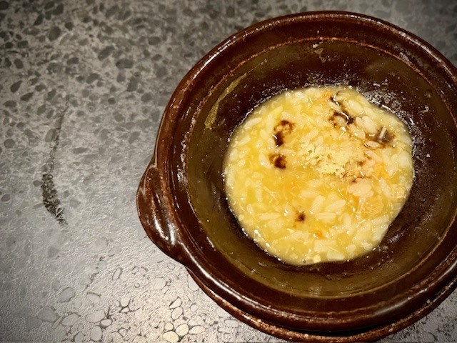 表面をカリッと焼いた青鮫のふかひれを高坂地鶏の鶏白湯でいただくひと品。今夜はそこに上海蟹も入れて、この時期ならではの特別な餡になっています。鶏白湯の濃厚な旨味にパキパキと音立てるふかひれの食感が実に小気味よく、美味しい。ふかひれを食べ終えると、同じ餡で炊いたリゾットが供され、コレがまた美味しい。