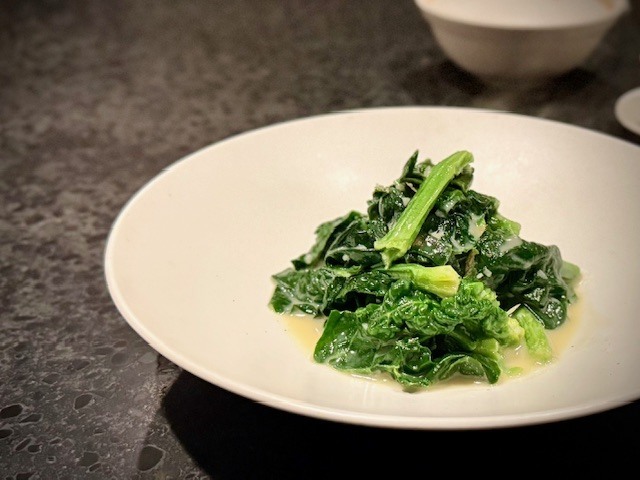 今だけの野菜、寒締めほうれん草を使った腐乳炒め。肉厚なほうれん草は葉と茎では違った味わいと食感が楽しめ、腐乳の絶妙なコクがこのほうれん草の旨味をより引き出しています。