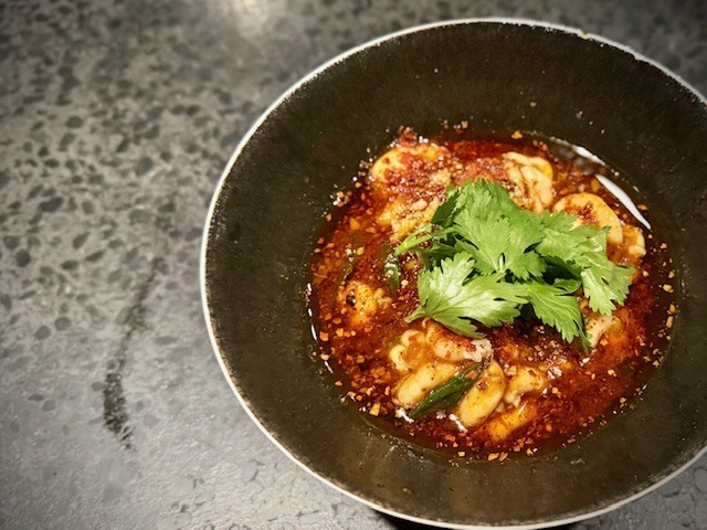 2品目は、地獄のような真っ赤な唐辛子の海の中で、クリーミーな甘味のある大地と海の食材が出逢う、白子と柔らか豆腐の激辛煮。ビシッと効いた辛味が豆腐と白子のそれぞれの甘味をより際立たせており、実に美味しい。
