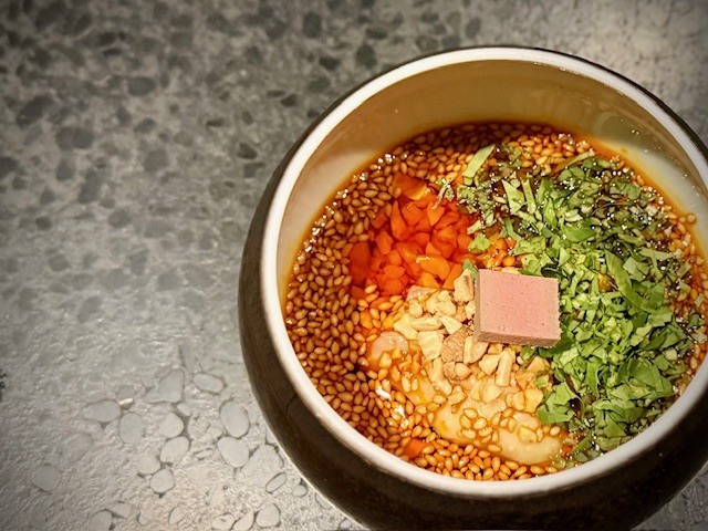 先程の『丹波高坂地鶏』のタレを活用する料理。まずは餃子です。もっちりとした皮に包まれた肉餡は旨味溢れ、そのままでも十分に美味しい。その餃子をこのタレにどっぷりと漬けて食べると、至福の美味しさ。そして、最後は四川山椒を練り込んだ特注麺を入れ、山椒と辣油の香りを楽しみます。