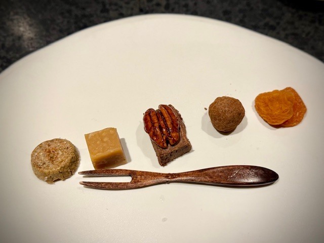 東方美人クッキー・ガトーショコラ・生姜の生キャラメル・カルキニョーリス・花梨のジャム。特にこのチョコレート・卵・山椒で作られた『ガトーショコラ』がホロホロとしているのに、口に入れるとスッと溶けるので衝撃的。