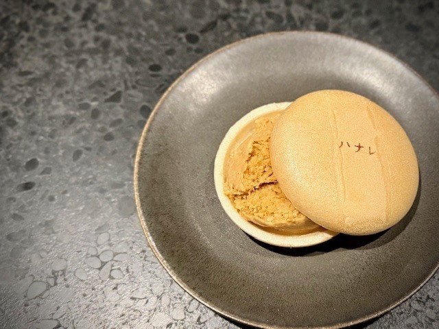 「ハナレ」と書かれた皮に挟まれているのは、紹興酒のアイス。濃密な甘みがあり、美味しい。