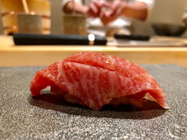 「はっこく」の中でもこの日本料理の技術を取り入れた種は、お気に入りの一貫。西京漬にすることで、鰆の旨味が味噌の甘味で累乗するような味わい。