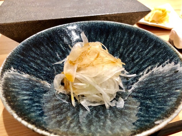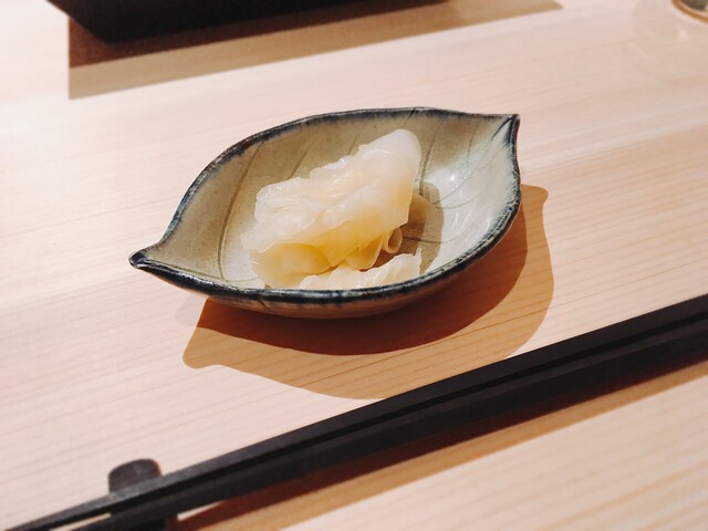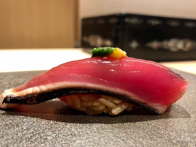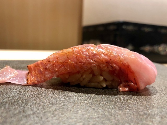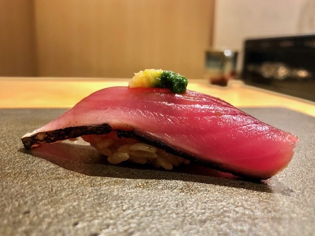 薬味の葱と生姜の2色が鰹の赤色を引き立ている目にも鮮やかな一貫。直前に皮目を炙ることで香ばしさも生まれており、モチモチとした身の旨味もいい。