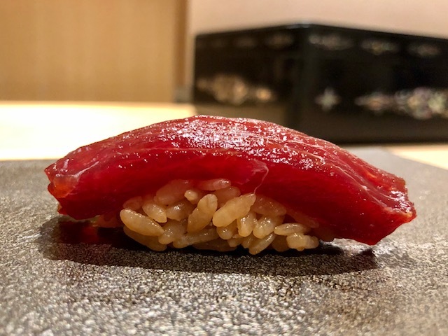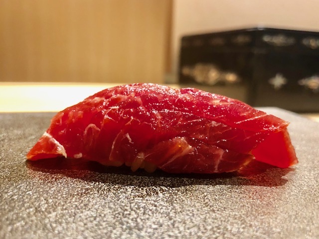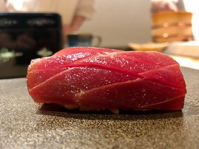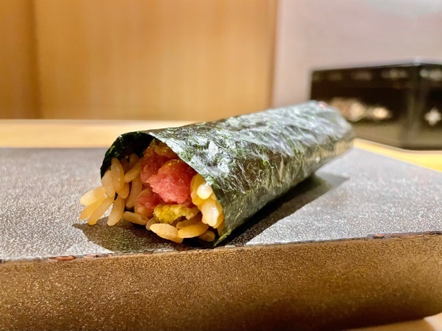 初手は佐藤さんのシャリと鮪の素晴らしさをダイレクトに感じられる心掴む手巻き。ガツンとくるシャリと鮪の旨味がたまらない。