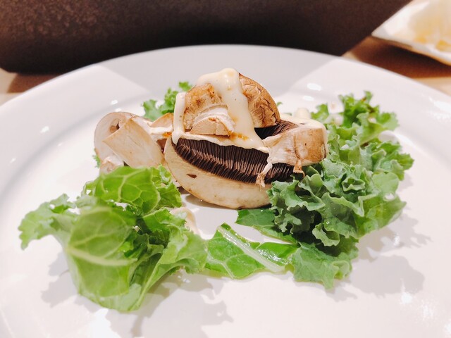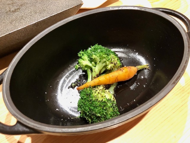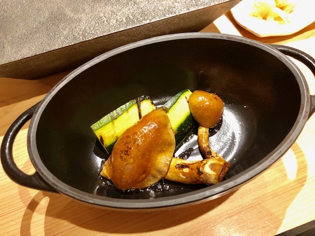 「はっこく」のロゴを付けた特注のバーミキュラに入れられた米油で焼いた焼き野菜。今夜は椎茸と舞茸。シンプルな味付けなので、香りが映えます。