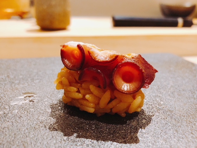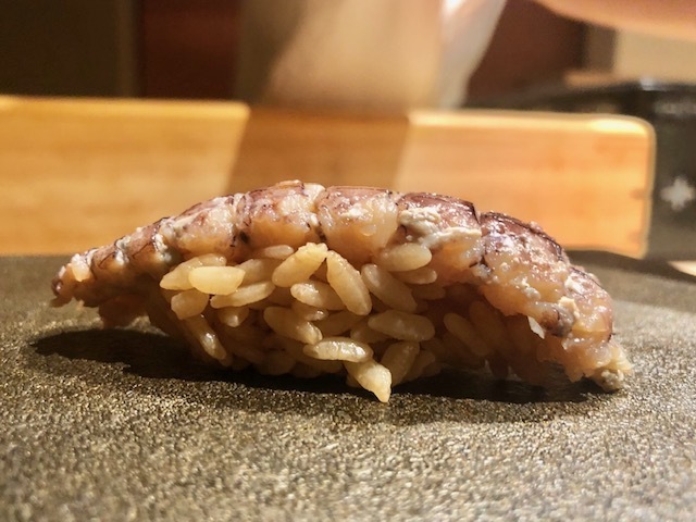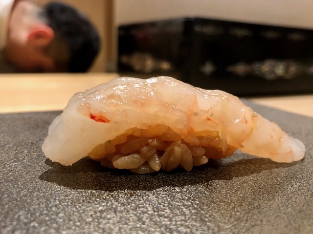 半身を捩って握った大胆な一貫。モチモチとしており、爽やかな旨味が駆け抜けます。